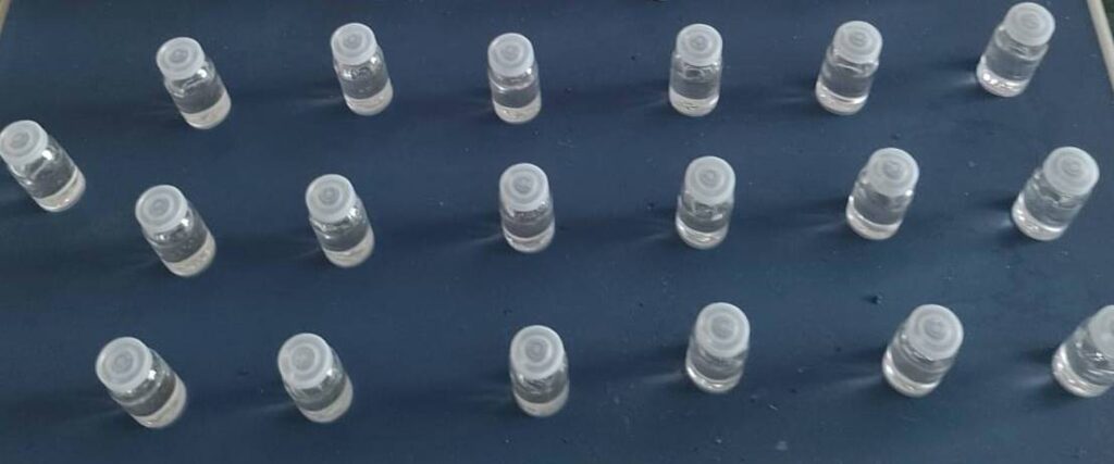 Após uma intensa varredura pela mata, os policiais localizaram e apreenderam uma sacola contendo 25 vidros de Loló e 40 pinos grandes de cocaína.