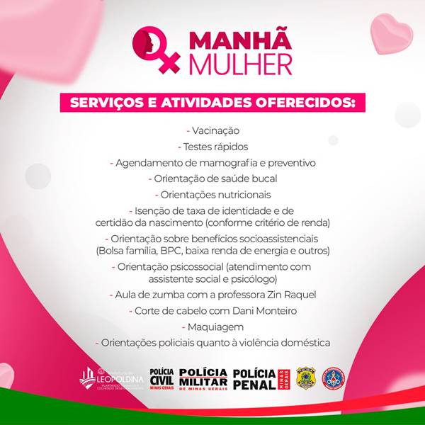 Evento promovido pela Prefeitura de Leopoldina acontece no sábado (11) na Praça Félix Martins com diversas atividades e serviços gratuitos dedicados exclusivamente às mulheres.