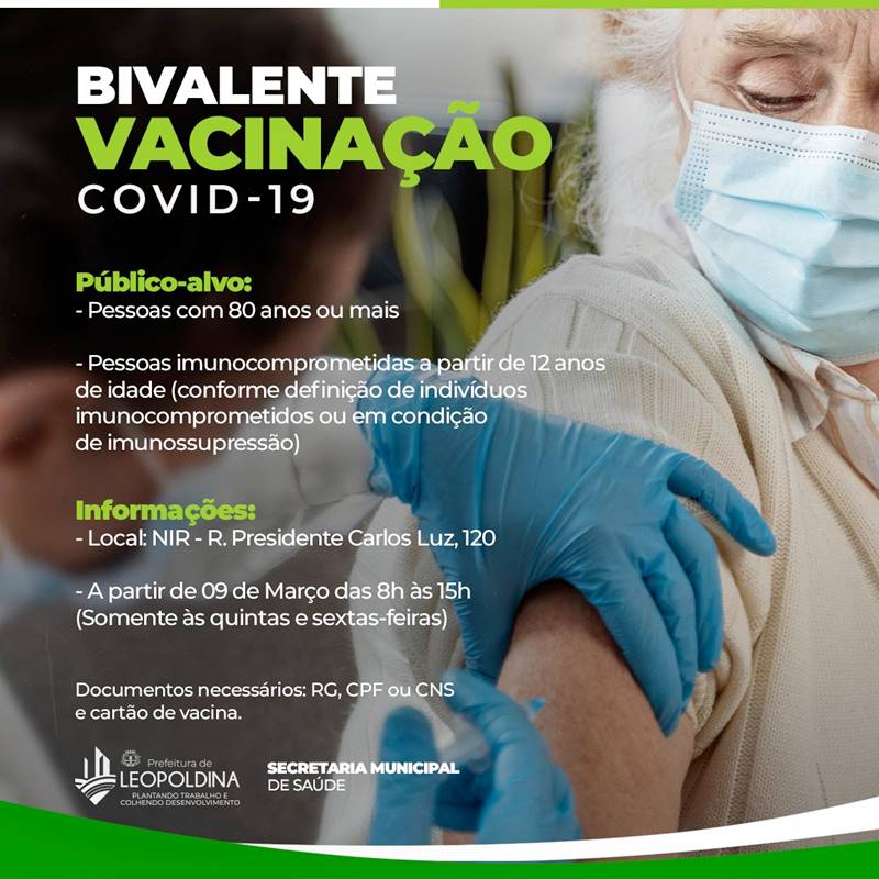 A Prefeitura de Leopoldina, por meio da Secretaria de Saúde, começa nesta quinta-feira, dia 9, a imunizar contra a Covid-19 idosos com 80 anos ou mais com a vacina Bivalente da Pfizer.