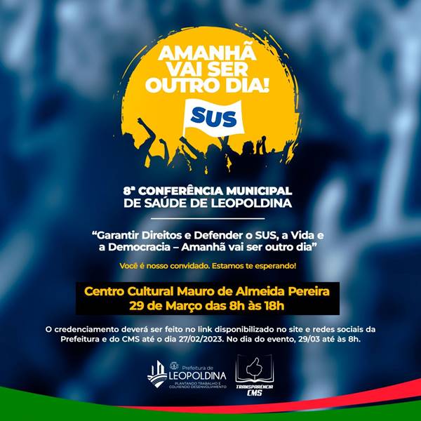 Em Leopoldina, a 8ª Conferência Municipal de Saúde está prevista para o dia 29 de março, no Anfiteatro do Centro Cultural Mauro de Almeida Pereira, de 08h às 18h. A etapa municipal da Conferência será organizada pelo Conselho Municipal de Saúde e Secretaria Municipal de Saúde de Leopoldina.