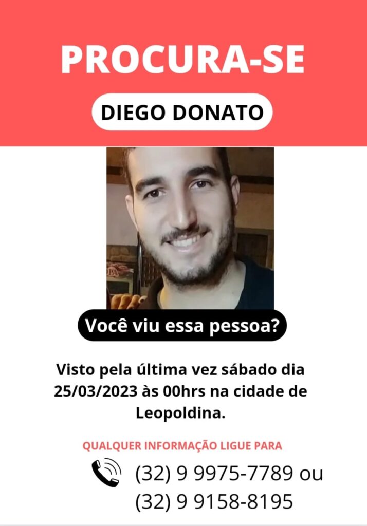 Uma família de Leopoldina procura por um homem que desapareceu em Leopoldina neste fim de semana. Diego Donato Porto, de 32 anos, foi visto pela última vez no sábado, por volta de 23h30.