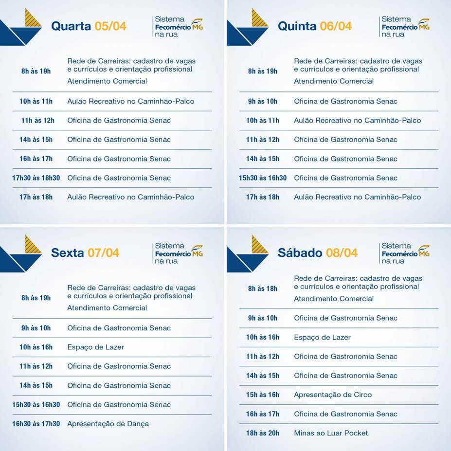 Nos demais dias os mesmos eventos acontecem em horários diferentes (veja a programação completa ao final deste texto) com algumas novidades como Espaço de Lazer, apresentação de circo no sábado e domingo, e uma versão pocket do Minas Ao Luar, o consagrado show de seresta que encanta o público por onde passa.