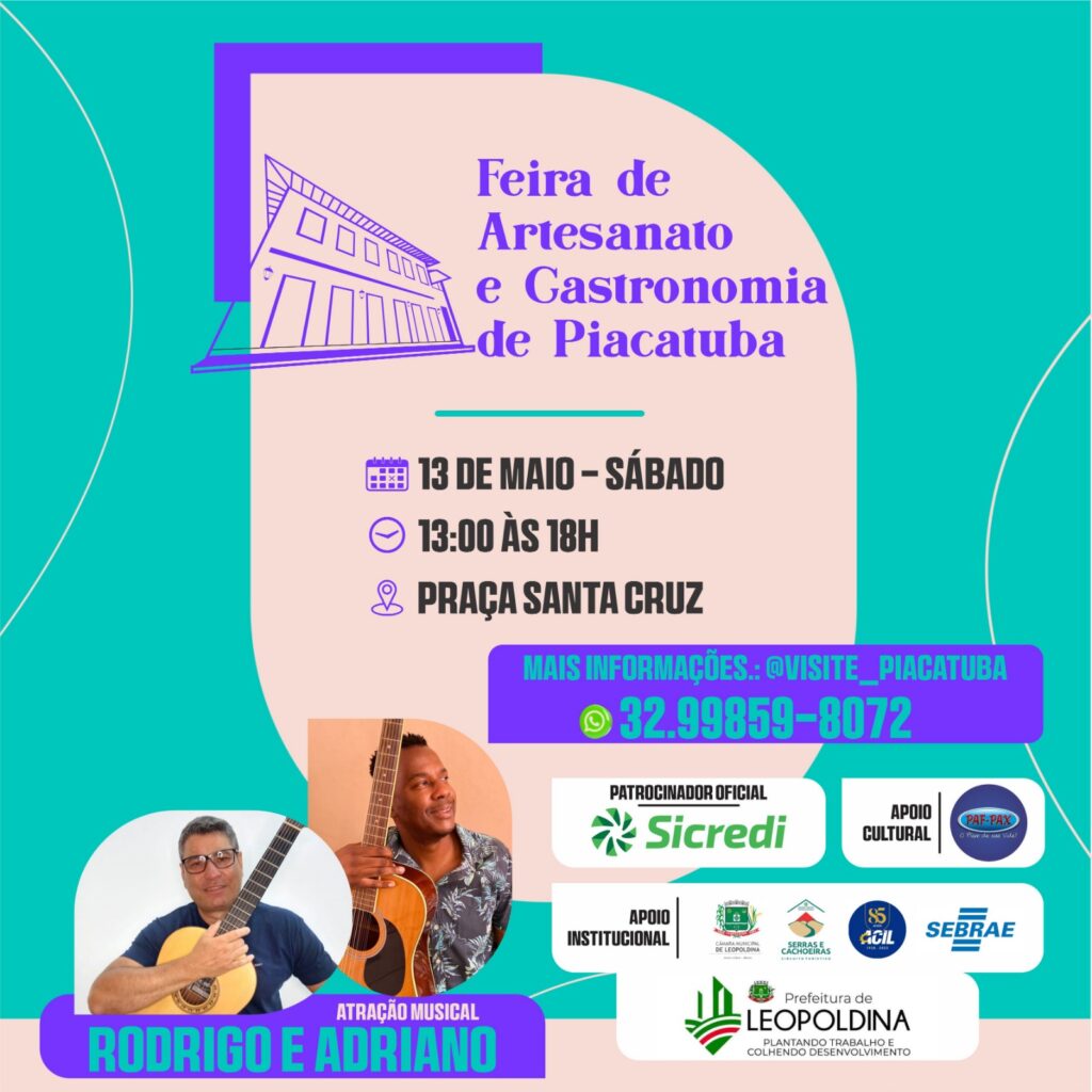 Neste sábado, dia 13 de maio, véspera de dia das mães, acontece a 1º “Feira de Artesanato e Gastronomia de Piacatuba”, uma realização de sete jovens moradores do distrito responsáveis pela página de fomento ao turismo local denominada “Visite Piacatuba”.