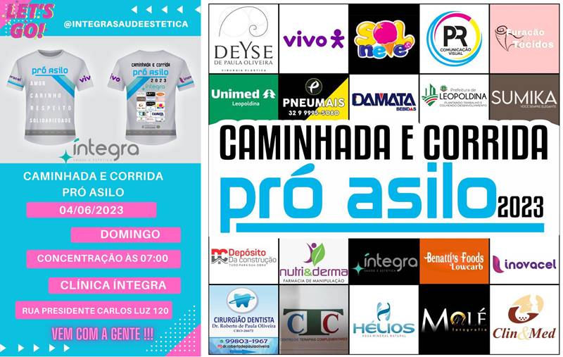 A Clínica Íntegra, juntamente com outras empresas de Leopoldina, promovem no domingo, dia 4 de junho, a Caminhada e Corrida Pró Asilo 2023, que terá toda renda obtida destinada à centenária instituição Asilo Santo Antônio, localizada no Bairro Seminário.