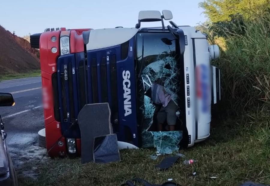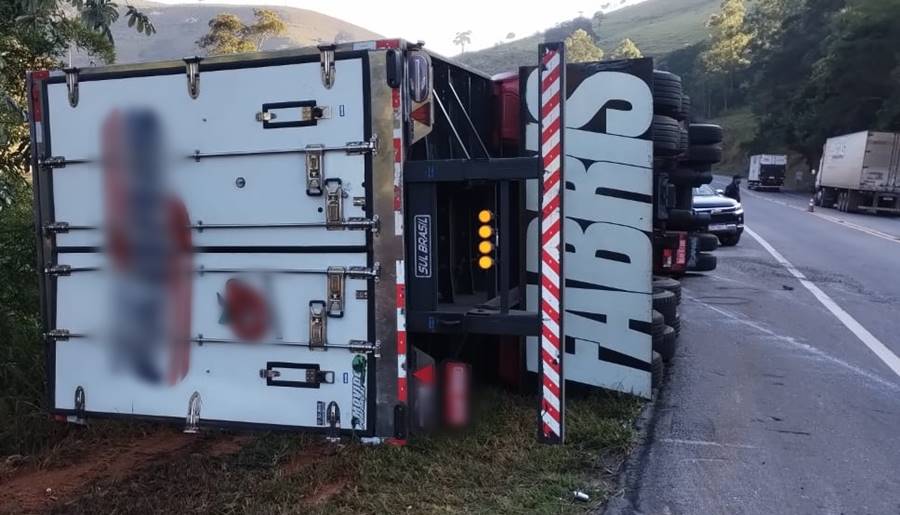 Uma carreta carregada com produtos diversos tombou na manhã desta segunda-feira, 12 de junho, na rodovia BR-116, em Leopoldina. O motorista saiu ileso.