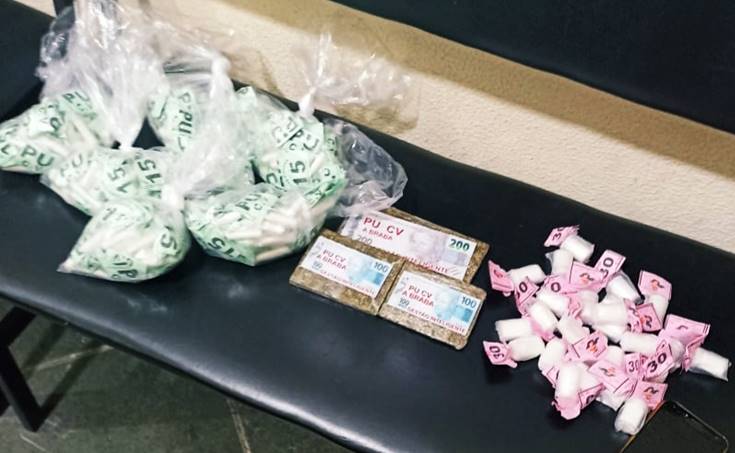 Ao todo, foram apreendidos 203 pinos de cocaína e três tabletes de maconha.