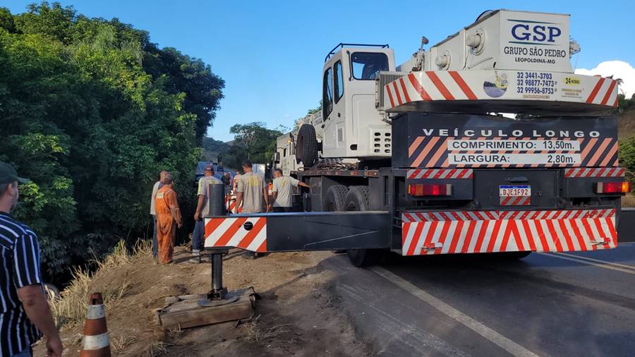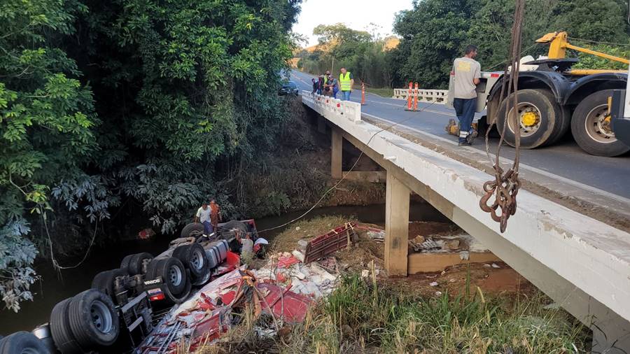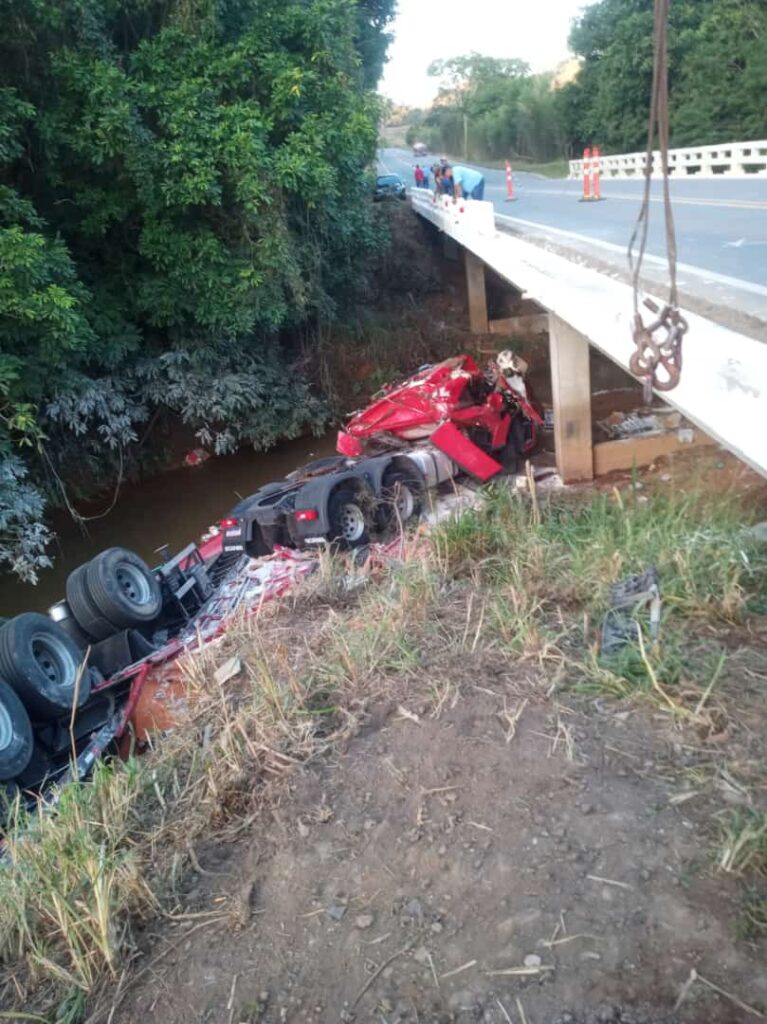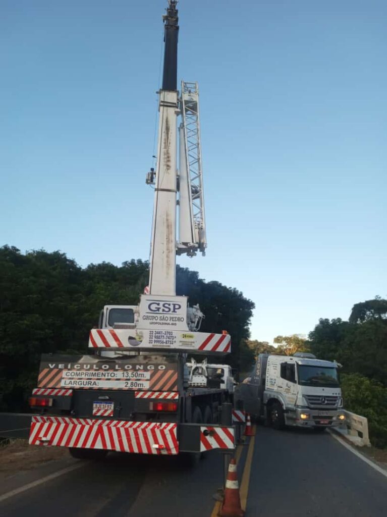 Entra no 2º dia a operação na BR-116, km 776, em Leopoldina para retirada de uma carreta que caiu da ponte sobre o Rio Pirapetinga.