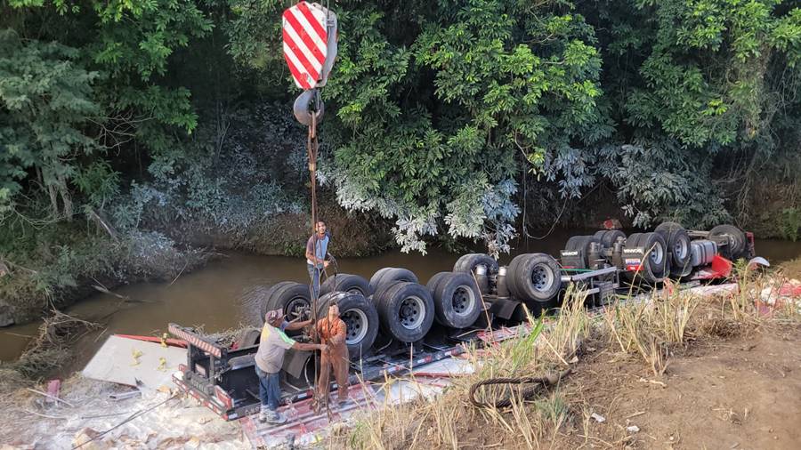 Operação para remoção de carreta que tombou às margens do Rio Pirapetinga em Leopoldina entra no segundo dia