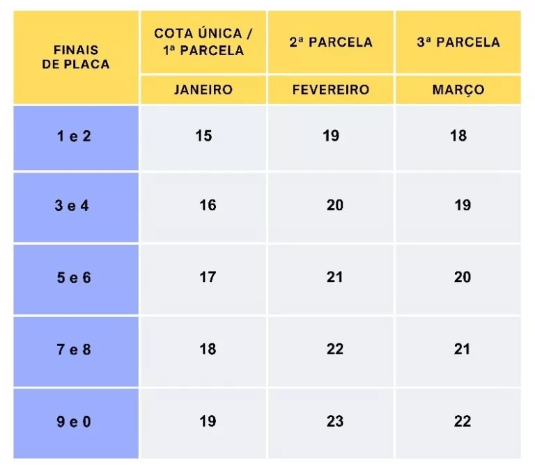 A escala de pagamentos da primeira parcela ou cota única começa em 15/1/2024 para veículos com finais de placas 1 e 2, e termina em 22/3/2024 para a quitação da terceira parcela dos veículos com finais de placas 9 e 0.