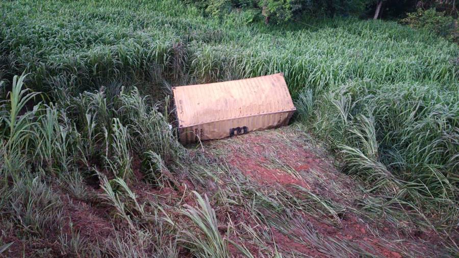 Com o tombamento, um dos containers se desprendeu e caiu em uma ribanceira localizada às margens da rodovia.