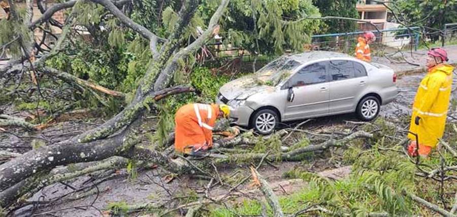 Uma árvore de grande porte caiu em cima de um carro na manhã desta segunda-feira, 1º de janeiro, em Muriaé.