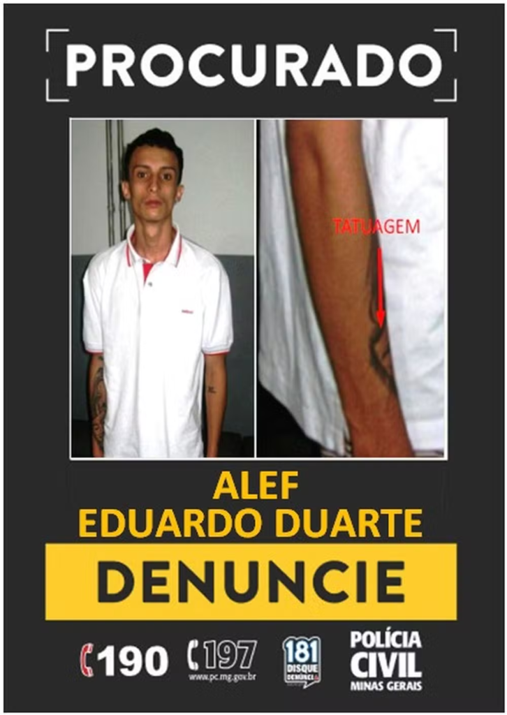 “Qualquer informação sobre o paradeiro do suspeito ou sobre o crime podem ser denunciadas à PCMG por meio do Whatsapp (31) 9 9483- 0008, com sigilo garantido, ou pelo 181”, ressalta Douglas.