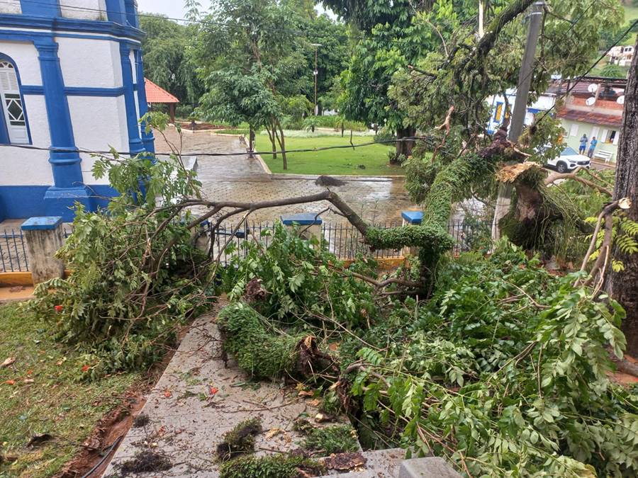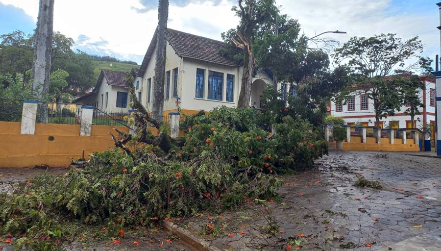 Uma árvore caiu na parte externa da Escola Estadual Pompílio Guimarães durante um vendaval registrado no distrito de Piacatuba, em Leopoldina, nesta terça-feira, 30 de janeiro.
