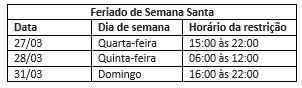 As restrições acontecerão nos seguintes dias e horários: quarta-feira (27/3), das 15 às 22h; na quinta-feira (28/3), entre 6h e 12h, e no domingo (31/3), das 16h às 22h.