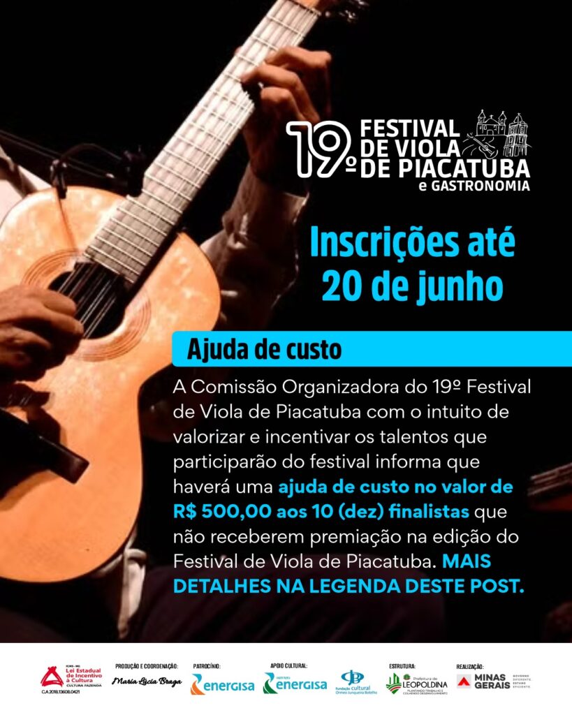 A produção do Festival de Viola de Piacatuba vai conceder uma ajuda de custo de R$ 500,00 aos 10 finalistas que não receberem premiação nesta 19° edição.