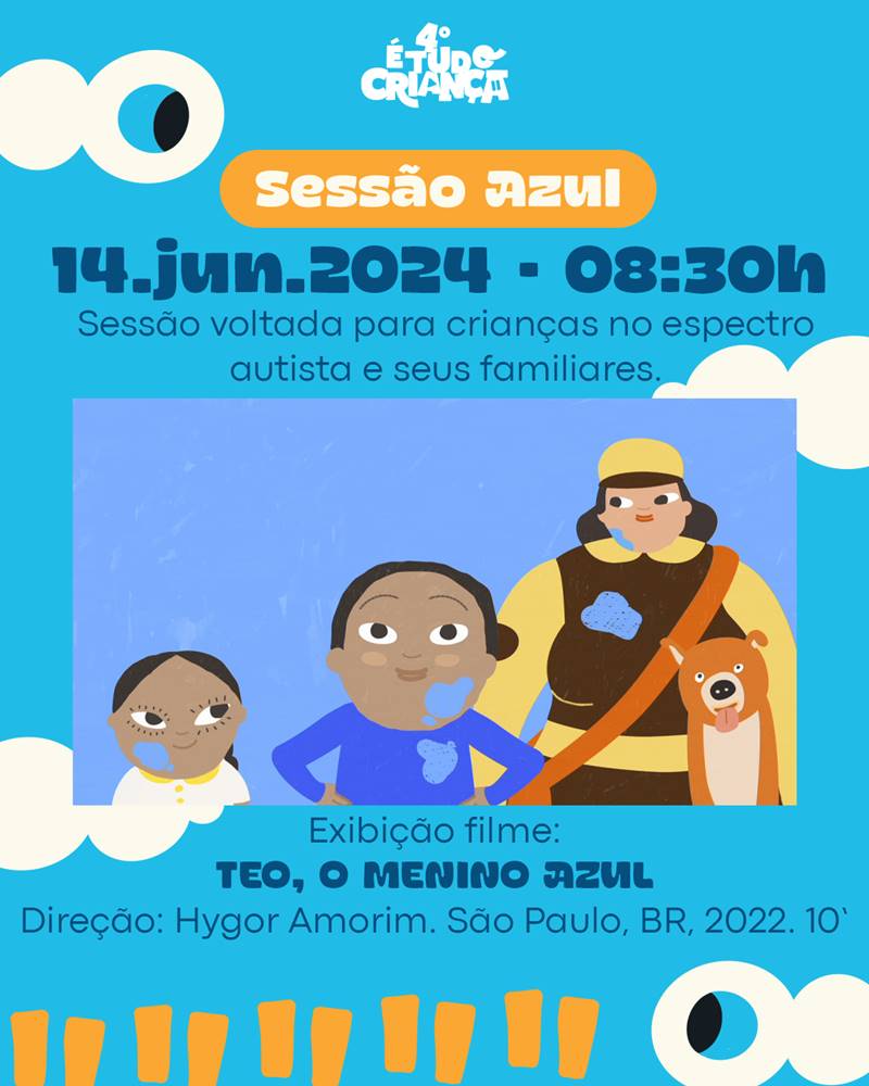 Nesta sexta-feira, 14 de junho, a partir das 8h30 acontece a apresentação da inédita Sessão Azul, durante a 4ª edição do Festival de Cinema Infantil “É Tudo Criança”. O evento será realizado no Centro Cultural Mauro de Almeida Pereira.