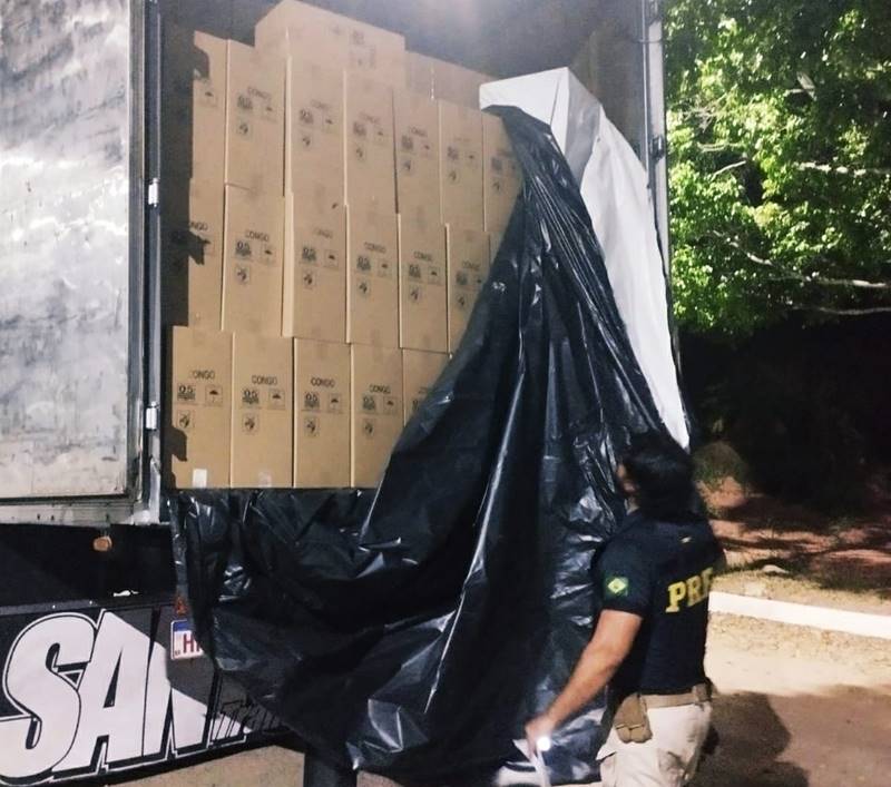Durante a conferência da carga transportada no interior do baú, os agentes verificaram que o veículo estava carregado com aproximadamente 7 milhões de cigarros de procedência nacional, distribuídos em várias caixas de papelão, totalizando 350.000 maços do tabaco.
