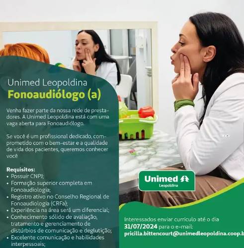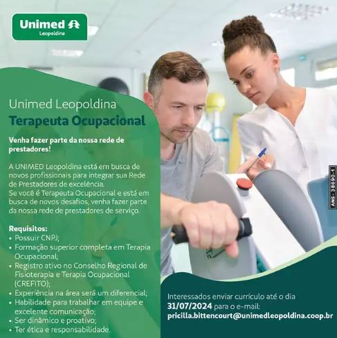 A Unimed Leopoldina divulgou abertura de cadastramento para sua Rede Prestadora. De acordo com as informações, as oportunidades são para fonoaudiólogo e terapeuta ocupacional.