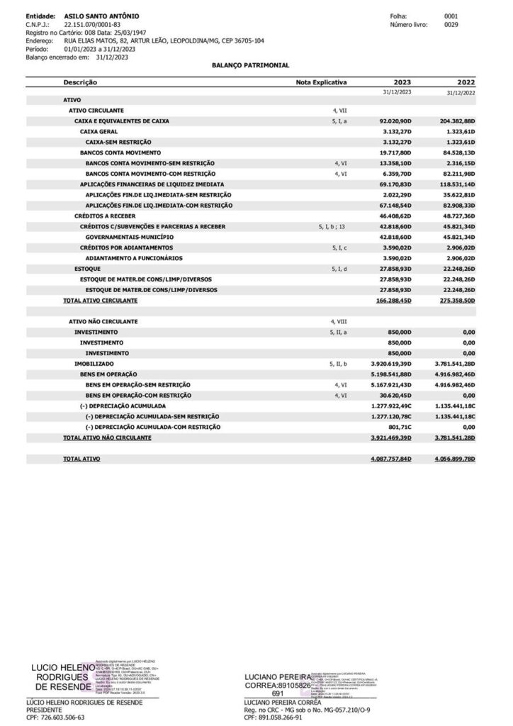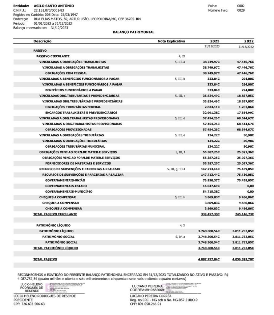 O Asilo Santo Antônio, em Leopoldina, divulgou Demonstrações Contábeis do Exercício de 2023. Confira abaixo: