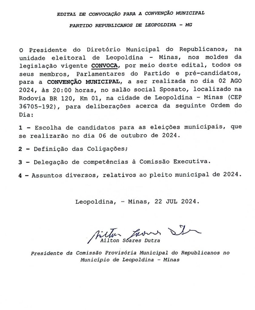 Edital de convocação para Convenção Municipal do Partido Republicanos de Leopoldina