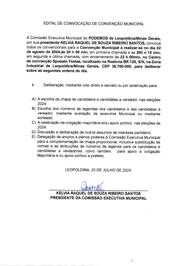 Edital de Convocação de Convenção Municipal do PODEMOS de Leopoldina