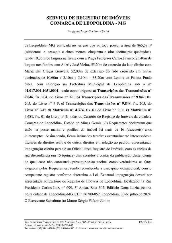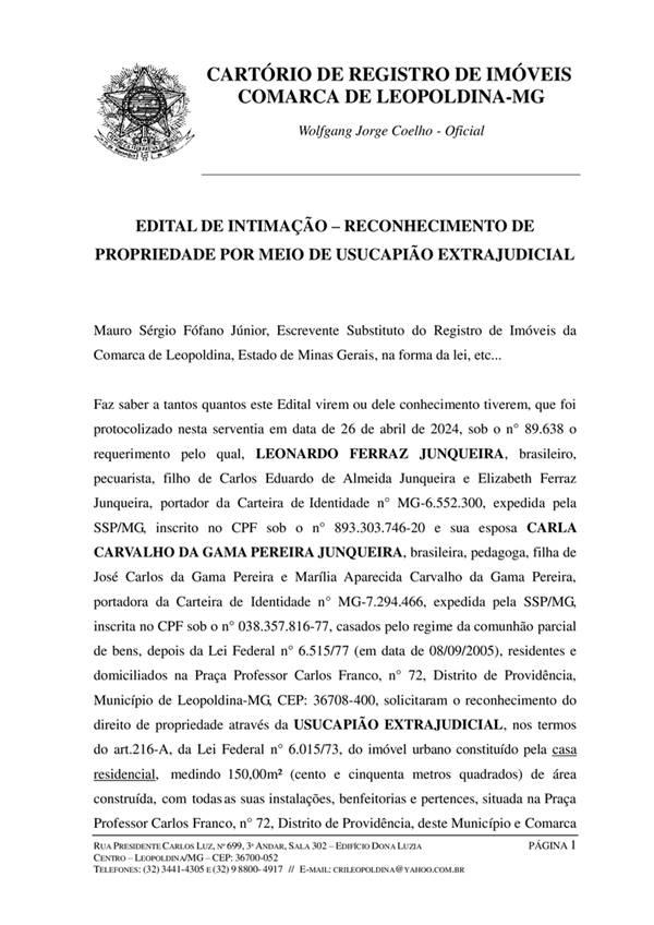 Faz saber a tantos quantos este Edital virem ou dele conhecimento tiverem, que foi protocolizado nesta serventia em data de 26 de abril de 2024, sob o n° 89.638 o requerimento pelo qual, LEONARDO FERRAZ JUNQUEIRA, brasileiro, pecuarista, filho de Carlos Eduardo de Almeida Junqueira e Elizabeth Ferraz Junqueira, portador da Carteira de Identidade n° MG-6.552.300, expedida pela SSP/MG, inscrito no CPF sob o n° 893.303.746-20 e sua esposa CARLA CARVALHO DA GAMA PEREIRA JUNQUEIRA, brasileira, pedagoga, filha de José Carlos da Gama Pereira e Marília Aparecida Carvalho da Gama Pereira, portadora da Carteira de Identidade n° MG-7.294.466, expedida pela SSP/MG, inscrita no CPF sob o n° 038.357.816-77, casados pelo regime da comunhão parcial de bens, depois da Lei Federal n° 6.515/77 (em data de 08/09/2005), residentes e domiciliados na Praça Professor Carlos Franco, n° 72, Distrito de Providência, Município de Leopoldina-MG, CEP: 36708-400, solicitaram o reconhecimento do direito de propriedade através da USUCAPIÃO EXTRAJUDICIAL, nos termos do art.216-A, da Lei Federal n° 6.015/73, do imóvel urbano constituído pela casa residencial, medindo 150,00m² (cento e cinquenta metros quadrados) de área construída, com todas as suas instalações, benfeitorias e pertences, situada na Praça Professor Carlos Franco, n° 72, Distrito de Providência, deste Município e Comarca de Leopoldina- MG, edificada no terreno que ao todo possui a área de 865,58m² (oitocentos e sessenta e cinco metros, cinquenta e oito decímetros quadrados), tendo 10,35m de largura na frente com a Praça Professor Carlos Franco, 25,40m de largura nos fundos com Aderly José Vieira, 55,20m de extensão do lado direito com Maria das Graças Gouveia, 52,00m de extensão do lado esquerdo em linhas quebradas de 10,60m + 3,10m + 5,10m + 33,20m com Lenina de Fátima Prado Silva, com inscrição na Prefeitura Municipal de Leopoldina sob o n° 01.017.001.1051.0001, tendo como origens: a) Transcrições das Transmissões n° 9.846, fls. 204, do Livro n° 3-F; b) Transcrições das Transmissões n° 9.847, fls. 205, do Livro n° 3-F; c) Transcrições das Transmissões n° 9.848, fls. 205, do Livro n° 3-F; d) Matrícula n° 4.374, fls. 01 do Livro n° 2; e, e) Matrícula n° 4.681, fls. 01 do Livro n° 2, todas do Cartório de Registro de Imóveis da cidade e Comarca de Leopoldina, Estado de Minas Gerais. Os Requerentes declararam que estão na posse mansa e pacífica do imóvel há mais de 16 (dezesseis) anos ininterruptos. Assim sendo, ficam intimados terceiros eventualmente interessados e titulares de direitos reais e de outros direitos em relação ao pedido, apresentando impugnação escrita perante ao Oficial deste Registro de Imóveis, com as razões de sua discordância em 15 (quinze) dias corridos a contar da publicação deste, ciente de que, caso não contestado presumir-se-ão aceitos como verdadeiros os fatos alegados pelos Requerentes, sendo reconhecida a usucapião extrajudicial, com o competente registro conforme determina a Lei. Eventual impugnação deverá ser apresentada ao Cartório de Registro de Imóveis de Leopoldina, localizado na Rua Presidente Carlos Luz, n° 699, 3º Andar, Sala 302, Edifício Dona Luzia, centro, nesta cidade de Leopoldina-MG, CEP: 36700-052. Leopoldina, 30 de julho de 2024. O Escrevente Substituto (a) Mauro Sérgio Fófano Júnior.