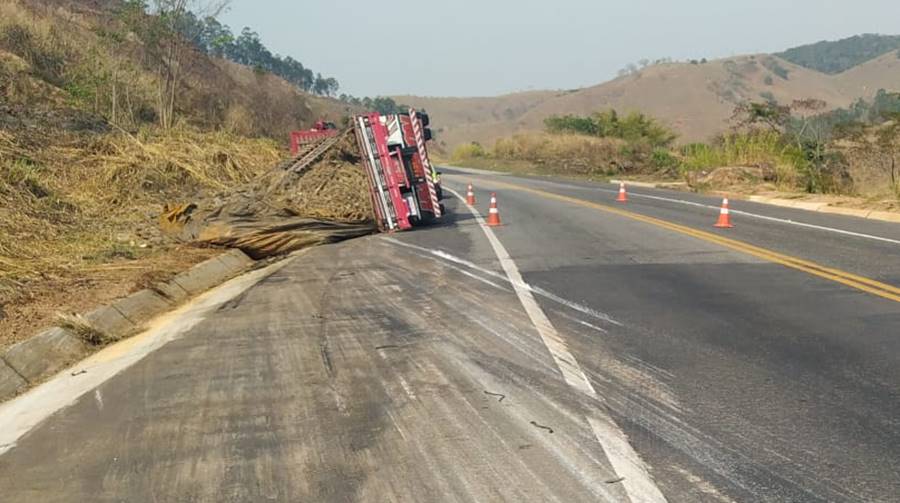O veículo de Feira de Santana, na Bahia, seguia carregado com abacaxi sentido Rio de Janeiro quando o motorista perdeu o controle da direção ao sair de uma curva e invadiu a contramão, tombando no acostamento da pista contrária.