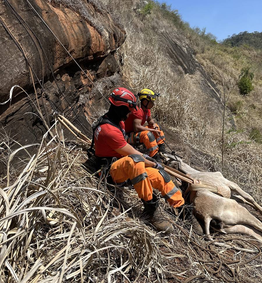 Corpo de Bombeiros resgata bezerra que caiu em pedreira de 70 metros em Leopoldina