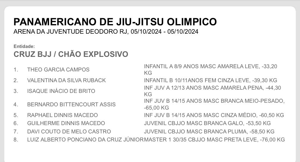 A Escola de Jiu-Jitsu Chão Explosivo – Academia Cruz BJJ (Brazilian Jiu-Jitsu) em Leopoldina participou no Rio de Janeiro do Pan-americano Jiu-Jitsu 2024, realizado no sábado, 5 de outubro, na Arena Olímpica Wenceslau Malta, a Arena da Juventude, em Deodoro.