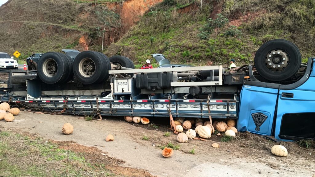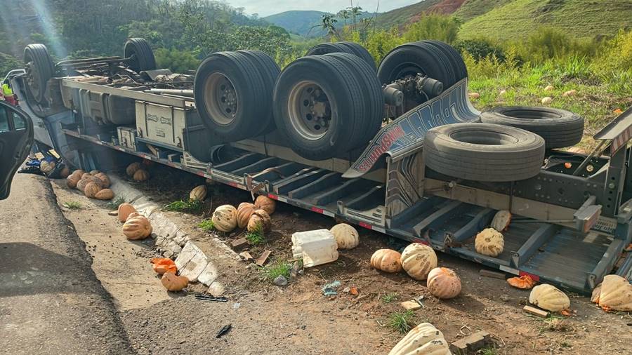 Um motorista que dirigia um caminhão carregado com abóbora saiu ileso após o veículo tombar nesta terça-feira, 22 de outubro, em Além Paraíba.