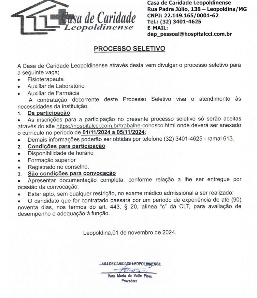 A Casa de Caridade Leopoldinense está com processo seletivo aberto para contratação de fisioterapeuta, auxiliar de laboratório e auxiliar de farmácia.