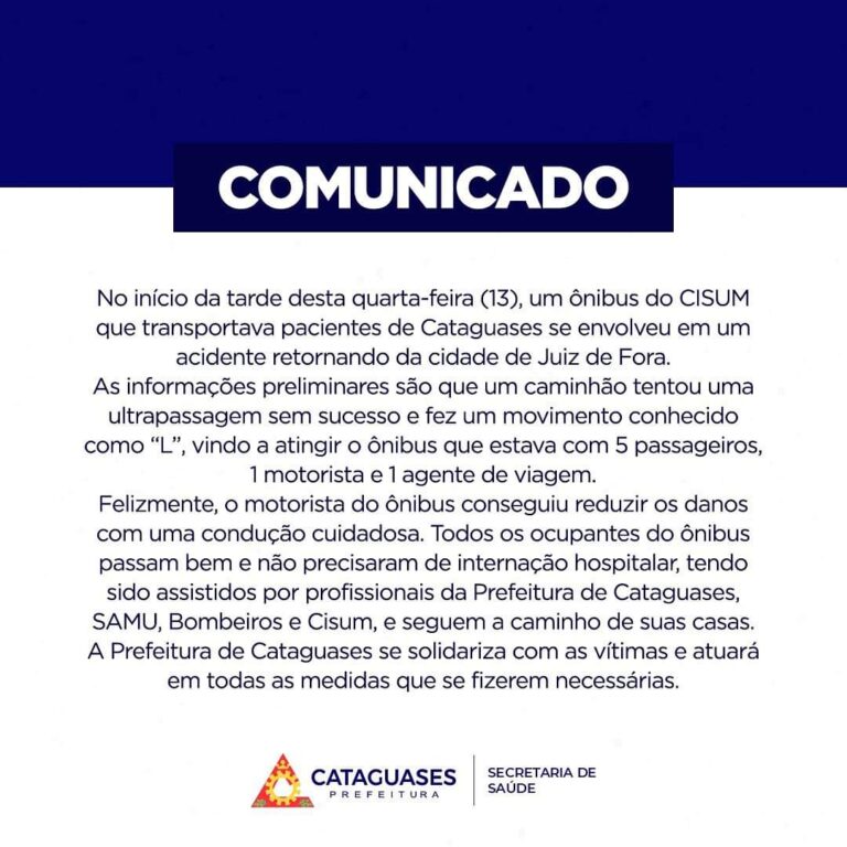 “Todos os ocupantes do ônibus passam bem e não precisaram de internação hospitalar, tendo sido assistidos por profissionais da Prefeitura de Cataguases, SAMU, Bombeiros e Cisum, e seguem a caminho de suas casas”, informa a Nota divulgada pela Secretaria de Saúde.