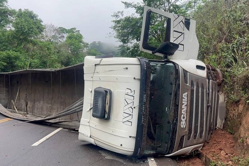 Carreta tomba e fica atravessada na BR-116 em Muriaé