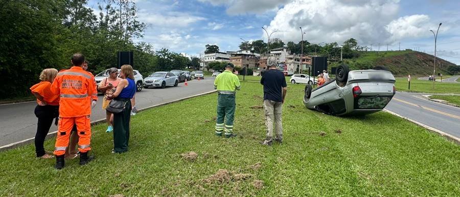 Um automóvel capotou na tarde desta sexta-feira, 22 de novembro, no trevo da BR-116 com a BR-120 e Bairro Alto do Cemitério, em Leopoldina.