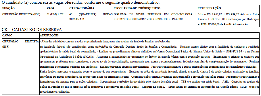 De acordo com o edital, a remuneração compreende o salário de R$ 2.967,82 + R$ 989,27 adicional extra jornada + R$ 3.581,03 de gratificação por dedicação ao PSF + R$500,00 de auxílio alimentação.