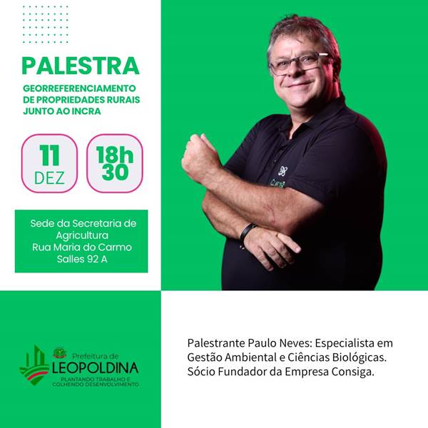 A Prefeitura de Leopoldina, por meio da Secretaria de Agricultura, convida todos os produtores rurais para uma palestra especial e gratuita sobre Georreferenciamento de Propriedades Rurais junto ao INCRA, com o especialista Paulo Neves, sócio fundador da empresa Consiga.