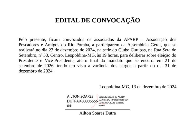 Edital de Convocação: Associação dos Pescadores e Amigos do Rio Pomba