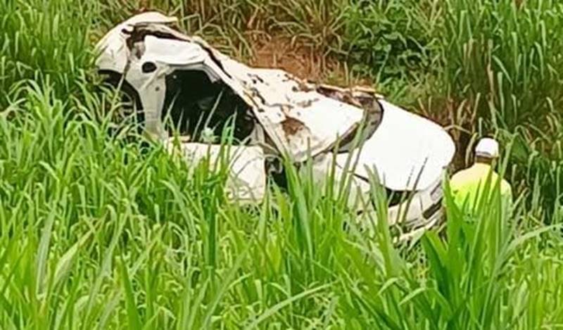 O automóvel invadiu a contramão de direção e saiu da pista de rolamento, descendo um barranco e capotando em seguida, imobilizado-se com as quatro rodas para cima.