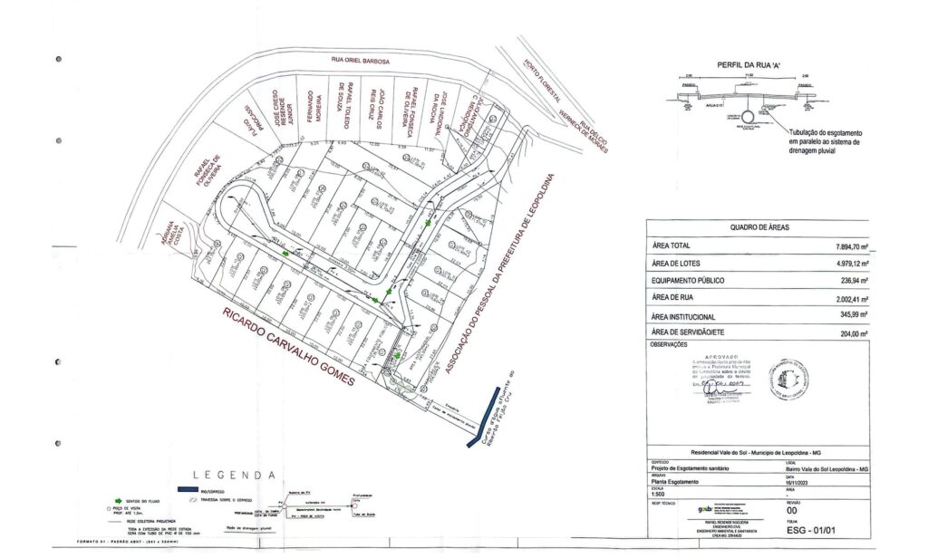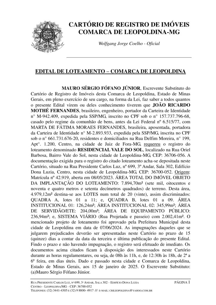 MAURO SÉRGIO FÓFANO JÚNIOR, Escrevente Substituto do Cartório de Registro de Imóveis desta Comarca de Leopoldina, Estado de Minas Gerais, em pleno exercício de seu cargo, na forma da Lei, faz saber a todos quantos o presente Edital virem ou deles conhecimento tiverem que JOÃO RICARDO MOTHÉ FERNANDES, brasileiro, engenheiro, portador da Carteira de Identidade n° M-942.409, expedida pela SSP/MG, inscrito no CPF sob o n° 157.737.796-68, casado pelo regime da comunhão de bens, antes da Lei Federal nº 6.515/77, com MARTA DE FÁTIMA MORAES FERNANDES, brasileira, aposentada, portadora da Carteira de Identidade n° M-2.893.933, expedida pela SSP/MG, inscrita no CPF sob o n° 661.731.676-20, residentes e domiciliados na Rua Delfim Moreira, n° 199, Apt°. 1.200, Centro, na cidade de Juiz de Fora-MG, requereu o registro do loteamento denominado RESIDENCIAL VALE DO SOL, localizado na Rua Oriel Barbosa, Bairro Vale do Sol, nesta cidade de Leopoldina-MG, CEP: 36706-056. A documentação exigida para o registro do citado loteamento acha-se depositada neste Cartório, situado na Rua Presidente Carlos Luz, nº 699, 3º Andar, Sala 302, Edifício Dona Luzia, Centro, nesta cidade de Leopoldina-MG, CEP: 36700-052. Origem: Matrícula nº 42.919, aberta em 08/05/2023. ÁREA TOTAL DO IMÓVEL OBJETO DA IMPLANTAÇÃO DO LOTEAMENTO: 7.894,70m² (sete mil, oitocentos e noventa e quatro metros e setenta decímetros quadrados) de terreno. Desta área, 4.979,12m² destina-se aos LOTES num total de 20 (vinte), assim discriminados: QUADRA A, lotes 01 a 11; e, QUADRA B, lotes 01 a 09. ÁREA INSTITUCIONAL 01: 126,24m²; ÁREA INSTITUCIONAL 02: 345,99m²; ÁREA DE SERVIDÃO/ETE: 204,00m²; ÁREA DE EQUIPAMENTO PÚBLICO: 236,94m²; e, SISTEMA VIÁRIO (Rua Projetada e passeio) com 2.002,41m². O mencionado projeto de loteamento foi aprovado pela Prefeitura Municipal desta cidade de Leopoldina em data de 07/06/2024. As impugnações daqueles que se julgarem prejudicados deverão ser apresentadas neste Cartório no prazo de 15 (quinze) dias a contar da data da terceira e última publicação do presente Edital. Findo o prazo e não havendo impugnação, o registro será efetuado de imediato. Os documentos acima citados ficam à disposição dos interessados neste Cartório durante as horas regulamentares, ou seja, de 08h às 11h, e, de 12:30h às 18h, de 2ª a 6ª feira, em dias úteis. Dado e passado nesta cidade e Comarca de Leopoldina, Estado de Minas Gerais, aos 15 de janeiro de 2025. O Escrevente Substituto: (a)Mauro Sérgio Fófano Júnior.