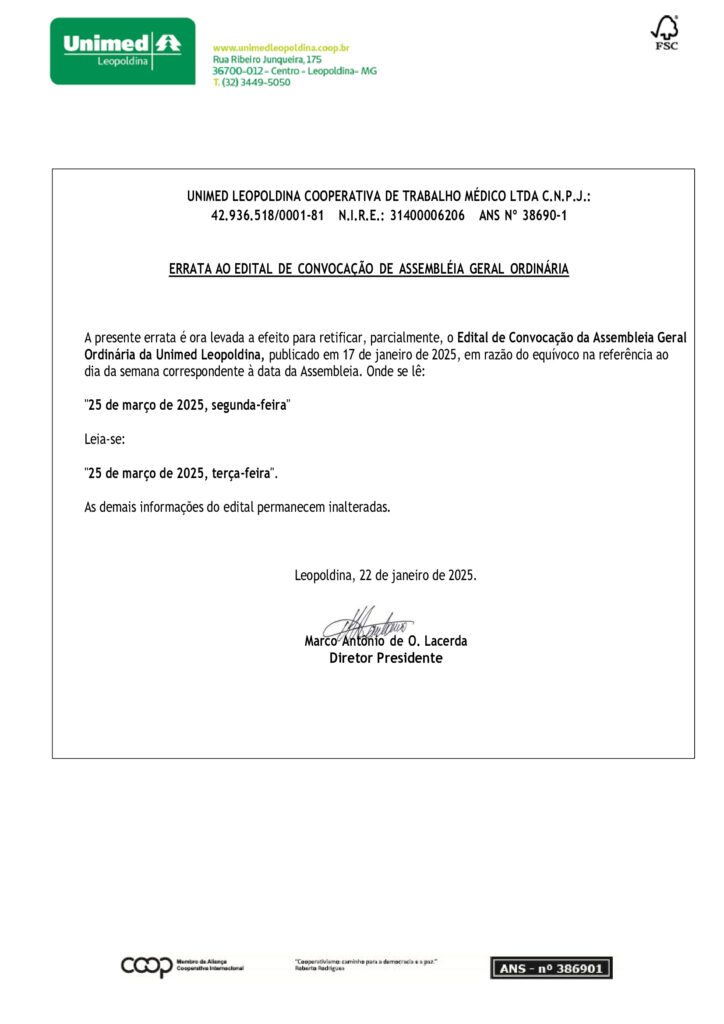 UNIMED LEOPOLDINA: Errata de Edital de Convocação de Assembleia Geral Ordinária