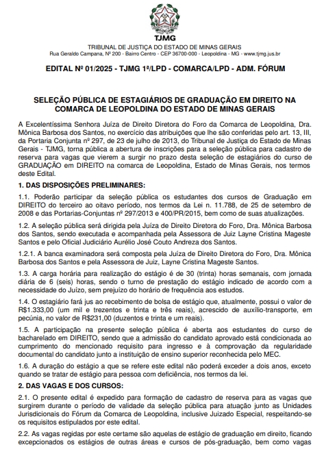 O Fórum da Comarca de Leopoldina abriu inscrições para seleção pública visando o preenchimento de vagas de estagiários de graduação em Direito.