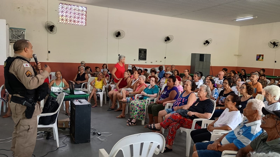 Os integrantes do projeto PM Mirim acompanharam os militares em uma palestra para os idosos no Centro de Convivência da Terceira Idade “Juca Nogueira”, juntamente com os funcionários da Prefeitura e assistência social do município. Durante a palestra, o Sargento Dárcio enfatizou sobre os riscos do ambiente virtual e como se proteger.