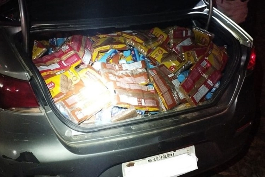 Durante a abordagem, foi constatado que o veículo estava lotado com biscoitos e macarrão oriundos do acidente.
