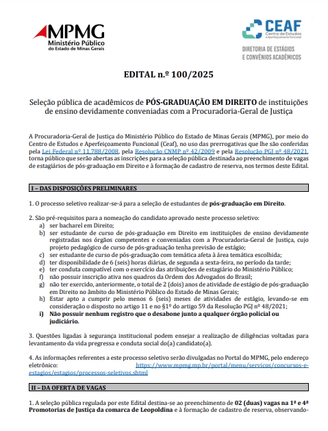 A A Procuradoria-Geral de Justiça do Ministério Público do Estado de Minas Gerais (MPMG), por meio do Centro de Estudos e Aperfeiçoamento Funcional (Ceaf), vai realizar processo seletivo para contratação de dois estagiários e formação de cadastro de reserva para atuação na 1ª e 4ª Promotorias de Justiça da Comarca de Leopoldina.