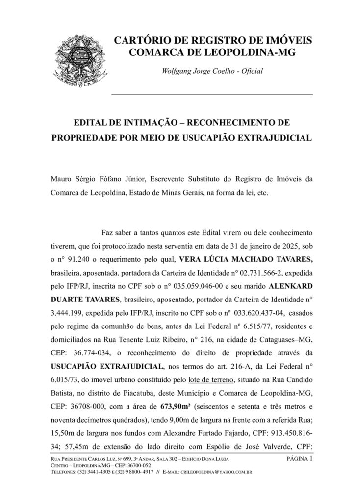 Faz saber a tantos quantos este Edital virem ou dele conhecimento tiverem, que foi protocolizado nesta serventia em data de 31 de janeiro de 2025, sob o n° 91.240 o requerimento pelo qual, VERA LÚCIA MACHADO TAVARES, brasileira, aposentada, portadora da Carteira de Identidade n° 02.731.566-2, expedida pelo IFP/RJ, inscrita no CPF sob o n° 035.059.046-00 e seu marido ALENKARD DUARTE TAVARES, brasileiro, aposentado, portador da Carteira de Identidade n° 3.444.199, expedida pelo IFP/RJ, inscrito no CPF sob o nº 033.620.437-04, casados pelo regime da comunhão de bens, antes da Lei Federal nº 6.515/77, residentes e domiciliados na Rua Tenente Luiz Ribeiro, n° 216, na cidade de Cataguases–MG, CEP: 36.774-034, o reconhecimento do direito de propriedade através da USUCAPIÃO EXTRAJUDICIAL, nos termos do art. 216-A, da Lei Federal n° 6.015/73, do imóvel urbano constituído pelo lote de terreno, situado na Rua Candido Batista, no distrito de Piacatuba, deste Município e Comarca de Leopoldina-MG, CEP: 36708-000, com a área de 673,90m² (seiscentos e setenta e três metros e noventa decímetros quadrados), tendo 9,00m de largura na frente com a referida Rua; 15,50m de largura nos fundos com Alexandre Furtado Fajardo, CPF: 913.450.816-34; 57,45m de extensão do lado direito com Espólio de José Valverde, CPF: 332.026.486-91; e, 60,75m de extensão do lado esquerdo, em segmentos de reta de 30,90m + 6,15m com Rita de Cássia Moraes, CPF: 610.932.707-72 + 23,70m com Thais de Matos Dutra, CPF: 077.104.396-16; sendo que o imóvel aqui referido possui como origem a matrícula nº 33.082 fls. 01, Livro 02, desta Serventia, e, cadastrado na Prefeitura Municipal de Leopoldina sob o nº 01.016.005.0120.0001. Os Requerentes declaram que estão na posse mansa, pacífica e contínua do imóvel há mais de 15 (quinze) anos ininterruptos, conforme consta do citado processo. Assim sendo, ficam intimados terceiros eventualmente interessados e titulares de direitos reais e de outros direitos em relação ao pedido, apresentando impugnação escrita perante ao Oficial deste Registro de Imóveis, com as razões de sua discordância em 15 (quinze) dias corridos a contar da publicação deste, ciente de que, caso não contestado presumir-se-ão aceitos como verdadeiros os fatos alegados pelos Requerentes, sendo reconhecida a usucapião extrajudicial, com o competente registro conforme determina a Lei. Eventual impugnação deverá ser apresentada ao Cartório de Registro de Imóveis de Leopoldina, localizado na Rua Presidente Carlos Luz, n° 699, 3º Andar, Sala 302, Edifício Dona Luzia, centro, nesta cidade de Leopoldina-MG, CEP: 36700-052. Leopoldina, 05 de fevereiro de 2025. O Escrevente Substituto: (a)Mauro Sérgio Fófano Júnior.
