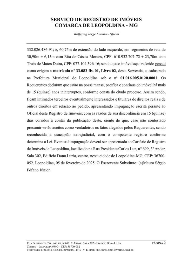 Mauro Sérgio Fófano Júnior, Escrevente Substituto do Registro de Imóveis da Comarca de Leopoldina, Estado de Minas Gerais, na forma da lei, etc.