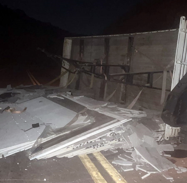 Um caminhão carregado com quartzo tombou na rodovia BR-267, entre os municípios de Argirita e Maripá de Minas.
