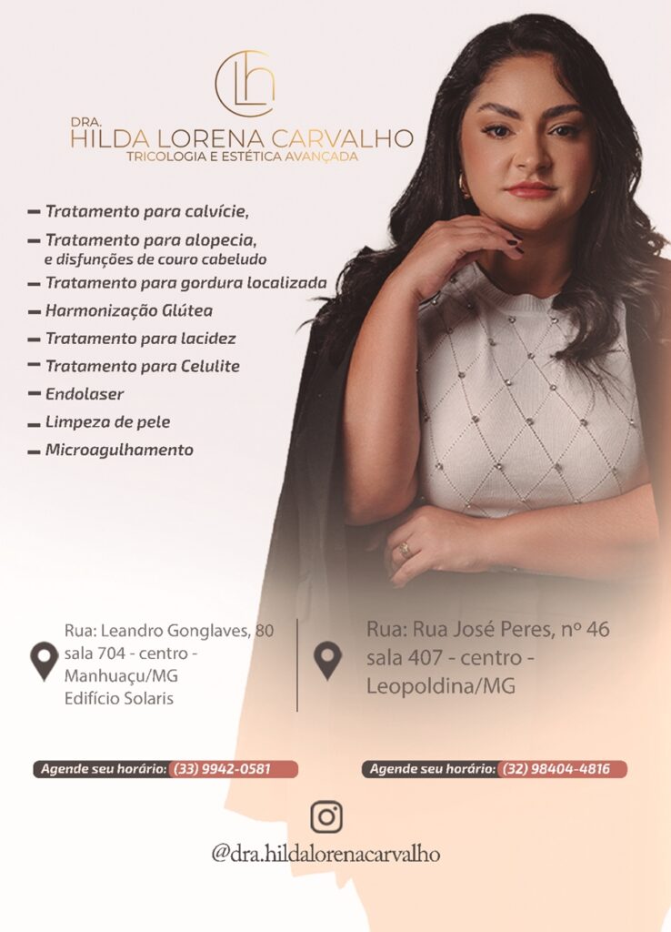 Em Leopoldina, o consultório da Dra. Hilda Lorena – Tricologia e Estética Avançada está localizado no centro da cidade, à Rua José Peres, nº 46, sala 407. Agendamento de horários: (32) 98404-4816.
