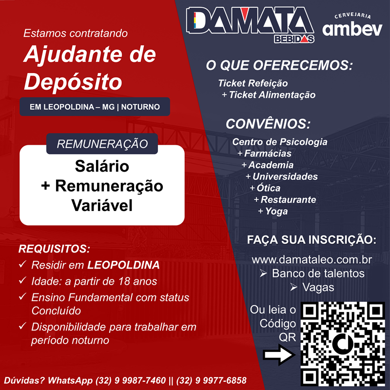 A DAMATA Bebidas divulgou a abertura de processos seletivos para contratar motorista e ajudante de entrega, além de ajudante de depósito noturno para o município de Leopoldina.
