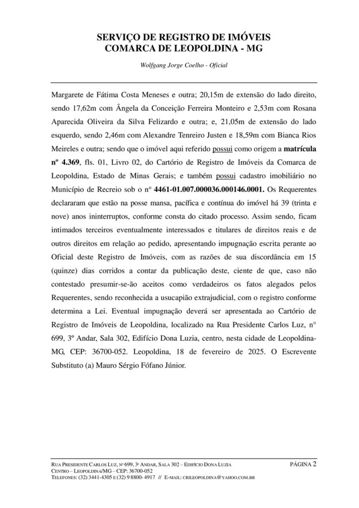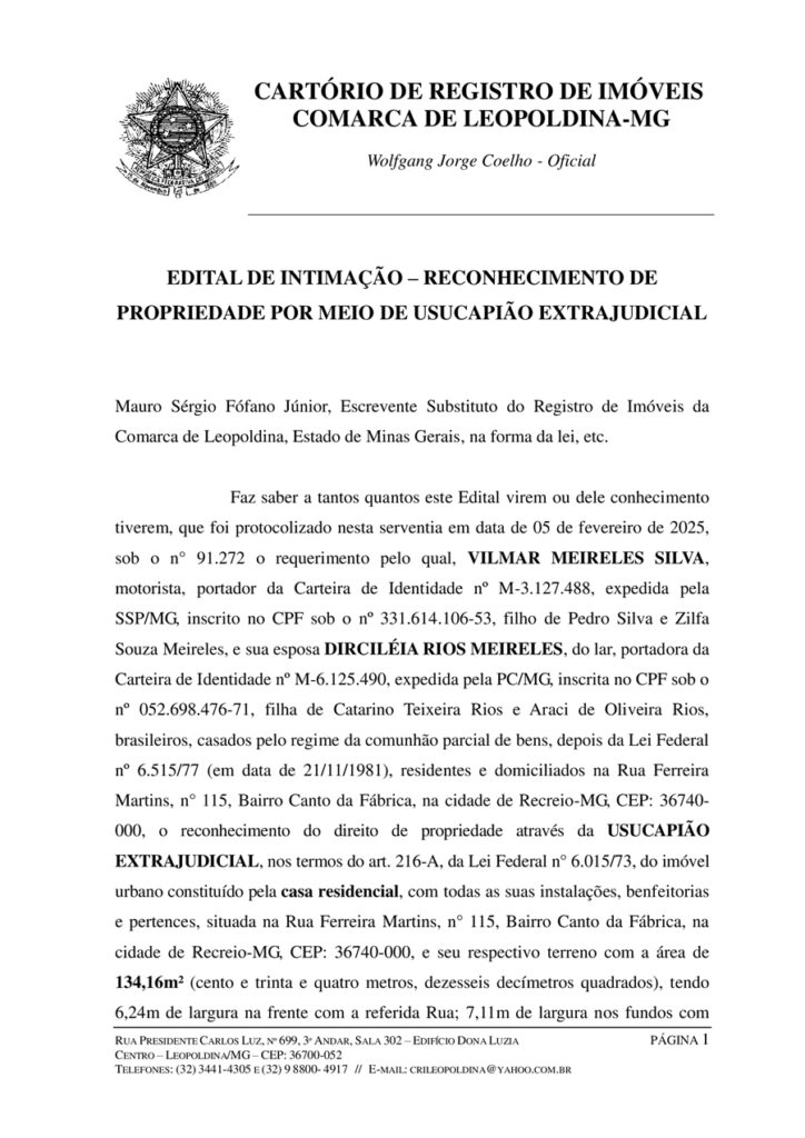 Faz saber a tantos quantos este Edital virem ou dele conhecimento tiverem, que foi protocolizado nesta serventia em data de 05 de fevereiro de 2025, sob o n° 91.272 o requerimento pelo qual, VILMAR MEIRELES SILVA, motorista, portador da Carteira de Identidade nº M-3.127.488, expedida pela SSP/MG, inscrito no CPF sob o nº 331.614.106-53, filho de Pedro Silva e Zilfa Souza Meireles, e sua esposa DIRCILÉIA RIOS MEIRELES, do lar, portadora da Carteira de Identidade nº M-6.125.490, expedida pela PC/MG, inscrita no CPF sob o nº 052.698.476-71, filha de Catarino Teixeira Rios e Araci de Oliveira Rios, brasileiros, casados pelo regime da comunhão parcial de bens, depois da Lei Federal nº 6.515/77 (em data de 21/11/1981), residentes e domiciliados na Rua Ferreira Martins, n° 115, Bairro Canto da Fábrica, na cidade de Recreio-MG, CEP: 36740-000, o reconhecimento do direito de propriedade através da USUCAPIÃO EXTRAJUDICIAL, nos termos do art. 216-A, da Lei Federal n° 6.015/73, do imóvel urbano constituído pela casa residencial, com todas as suas instalações, benfeitorias e pertences, situada na Rua Ferreira Martins, n° 115, Bairro Canto da Fábrica, na cidade de Recreio-MG, CEP: 36740-000, e seu respectivo terreno com a área de 134,16m² (cento e trinta e quatro metros, dezesseis decímetros quadrados), tendo 6,24m de largura na frente com a referida Rua; 7,11m de largura nos fundos com Margarete de Fátima Costa Meneses e outra; 20,15m de extensão do lado direito, sendo 17,62m com Ângela da Conceição Ferreira Monteiro e 2,53m com Rosana Aparecida Oliveira da Silva Felizardo e outra; e, 21,05m de extensão do lado esquerdo, sendo 2,46m com Alexandre Tenreiro Justen e 18,59m com Bianca Rios Meireles e outra; sendo que o imóvel aqui referido possui como origem a matrícula nº 4.369, fls. 01, Livro 02, do Cartório de Registro de Imóveis da Comarca de Leopoldina, Estado de Minas Gerais; e também possui cadastro imobiliário no Município de Recreio sob o no 4461-01.007.000036.000146.0001. Os Requerentes declararam que estão na posse mansa, pacífica e contínua do imóvel há 39 (trinta e nove) anos ininterruptos, conforme consta do citado processo. Assim sendo, ficam intimados terceiros eventualmente interessados e titulares de direitos reais e de outros direitos em relação ao pedido, apresentando impugnação escrita perante ao Oficial deste Registro de Imóveis, com as razões de sua discordância em 15 (quinze) dias corridos a contar da publicação deste, ciente de que, caso não contestado presumir-se-ão aceitos como verdadeiros os fatos alegados pelos Requerentes, sendo reconhecida a usucapião extrajudicial, com o registro conforme determina a Lei. Eventual impugnação deverá ser apresentada ao Cartório de Registro de Imóveis de Leopoldina, localizado na Rua Presidente Carlos Luz, n° 699, 3º Andar, Sala 302, Edifício Dona Luzia, centro, nesta cidade de Leopoldina-MG, CEP: 36700-052. Leopoldina, 18 de fevereiro de 2025. O Escrevente Substituto (a) Mauro Sérgio Fófano Júnior.